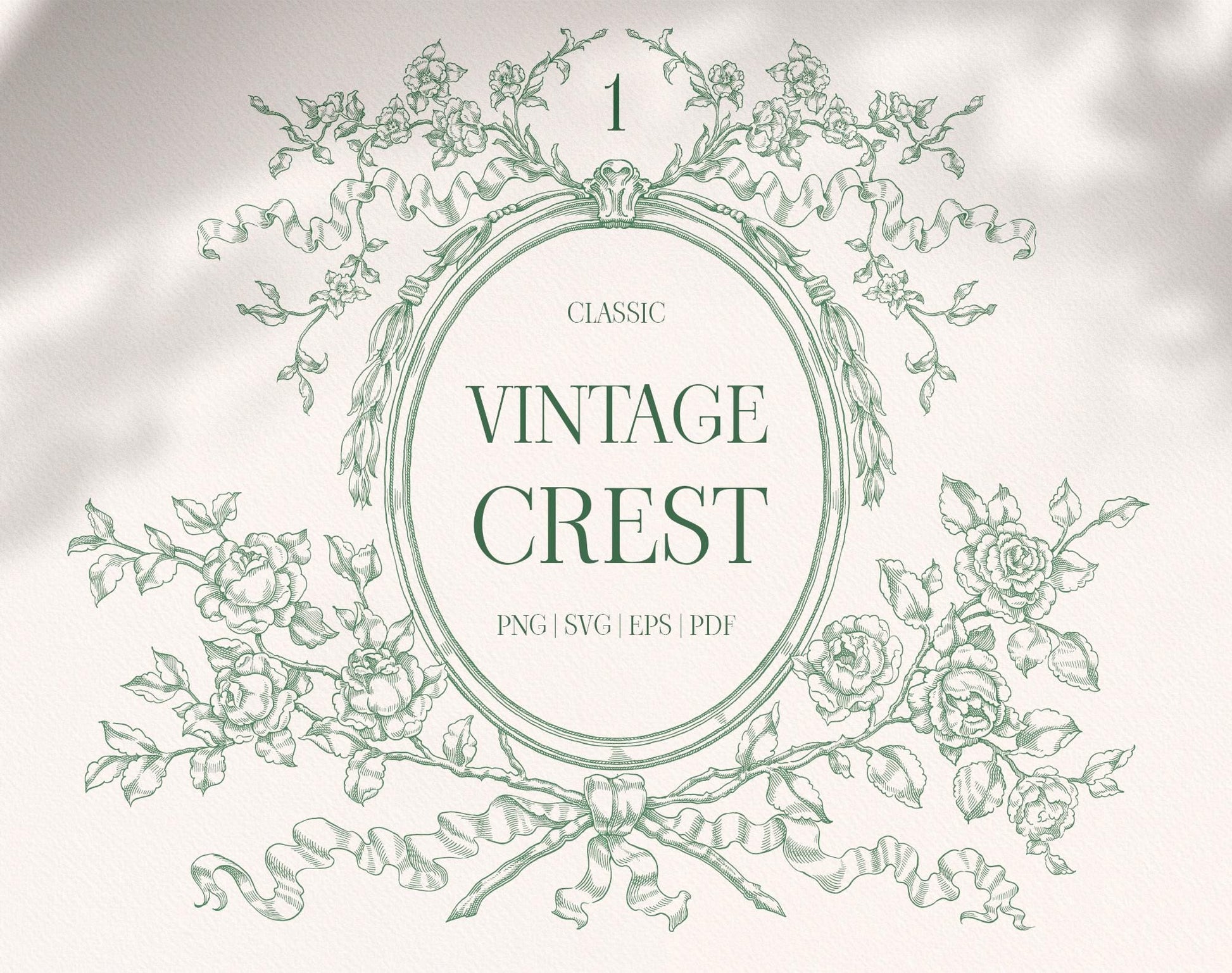 A single sage green crest with a refined baroque border, Victorian rose details, and clean line art. Ideal for logos, wedding invitations, stationery, and classic branding.